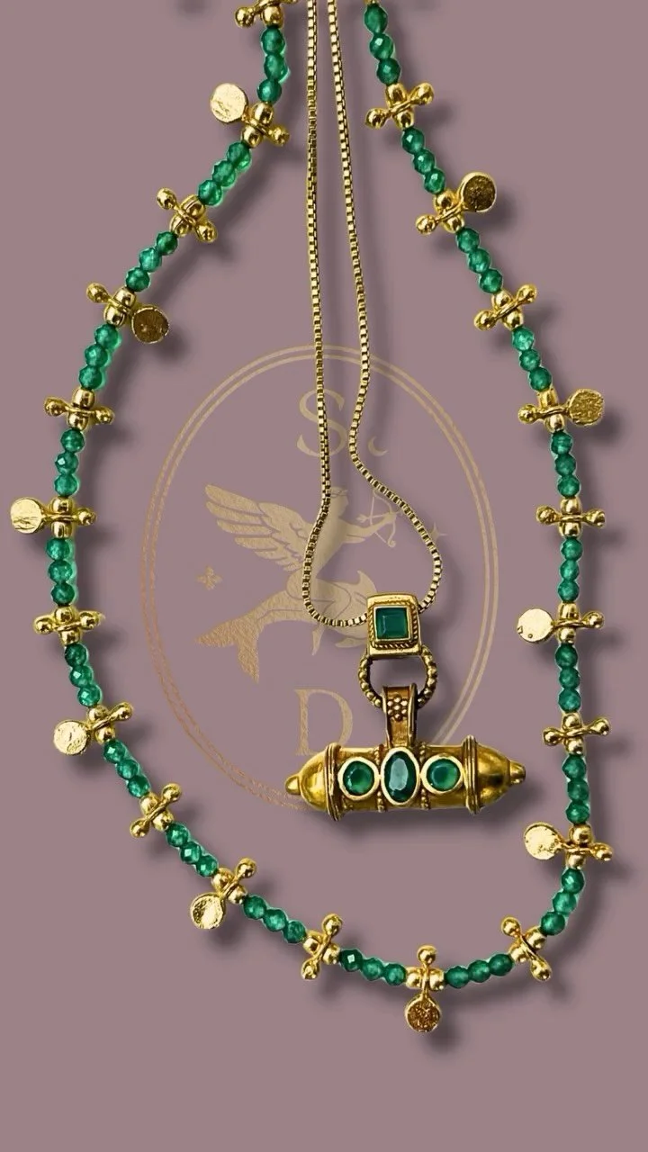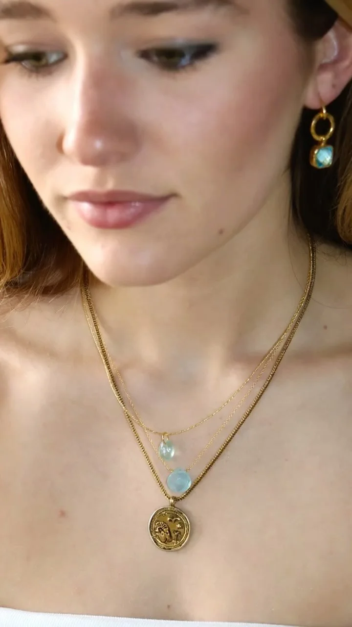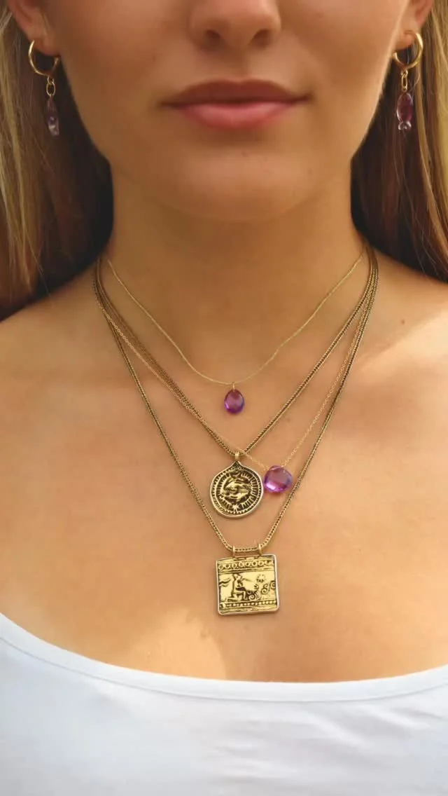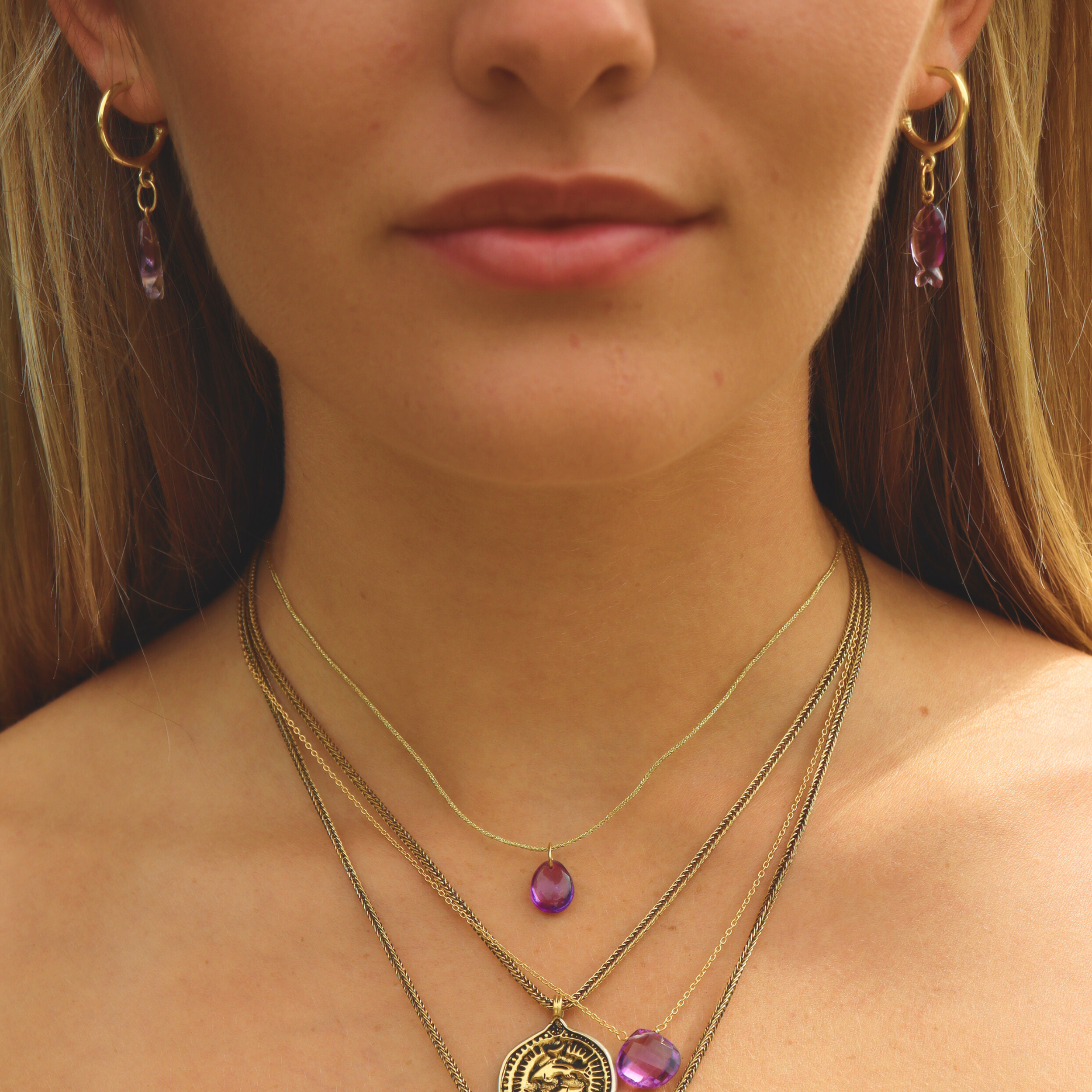 Each piece is a one-off, with a story, an eclectic mix of inspirations and visual language inspired by Sally’s travels to remote places and the cultures she has encountered and fallen in love with along the way. Exotic rocks and precious stones set in gold, antique talismans from around the world adorn hand made chains, creating jewellery that feels as mythical and magical as it is beautiful.