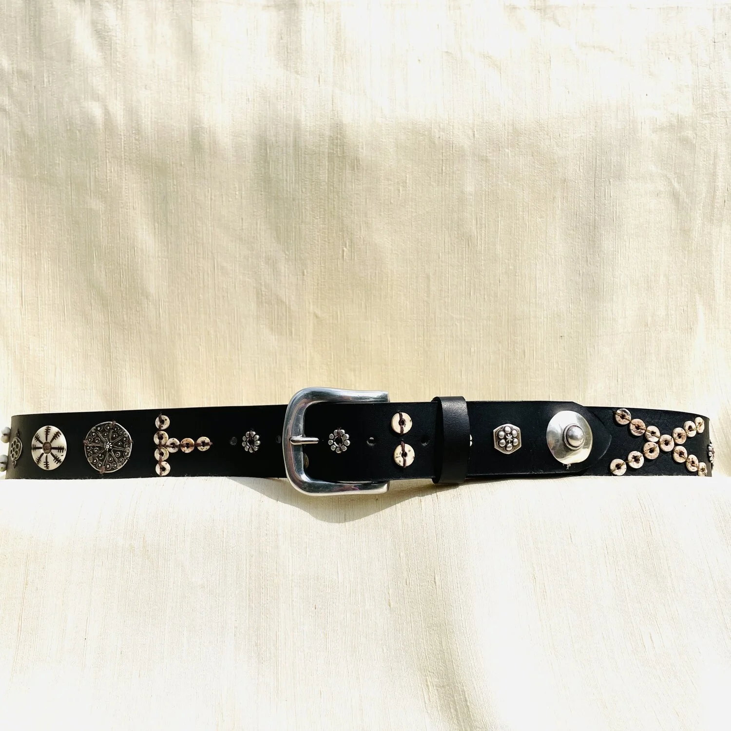 The show stopping unisex belt, adorned with ostrich egg, operculum shells, cowrie shells, antique coin, antique Yemeni and East African buttons and talisman on a fine black leather.