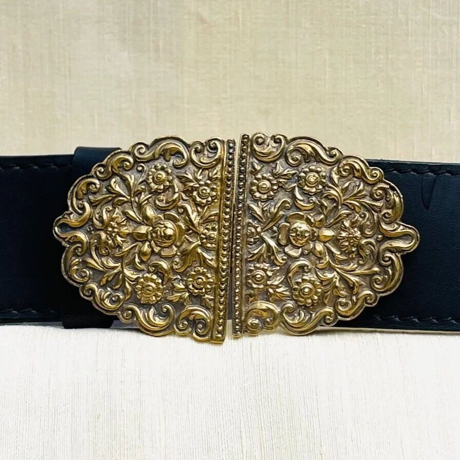 This stunning buckle is an ancient Persian design. The flowers are an ancient Zoroastrian symbol of love and fertility . This looks fabulous with jeans or over a dress.