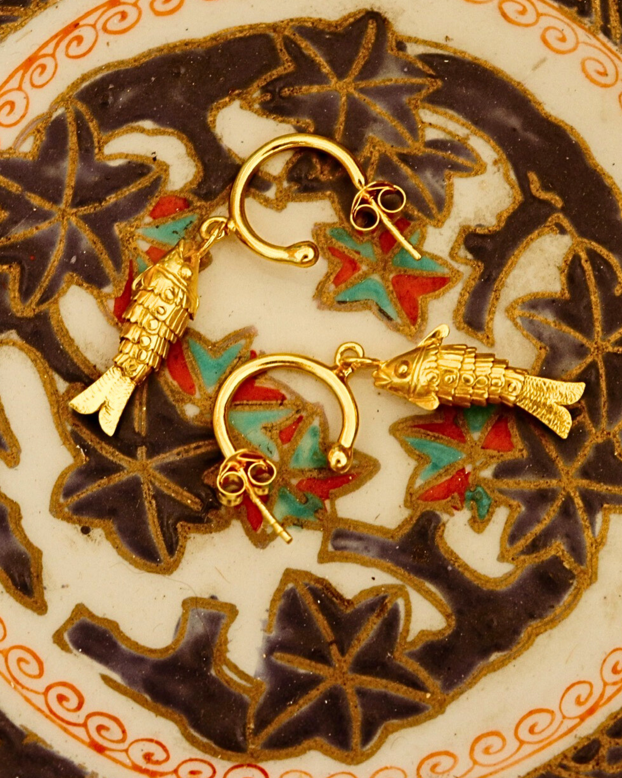 The mythological Ikhthyes were two large Syrian river fish who rescued Aphrodite and Eros from the monstrous Typhoeus. Feel a little braver with Sally’s charming protective talisman earrings.