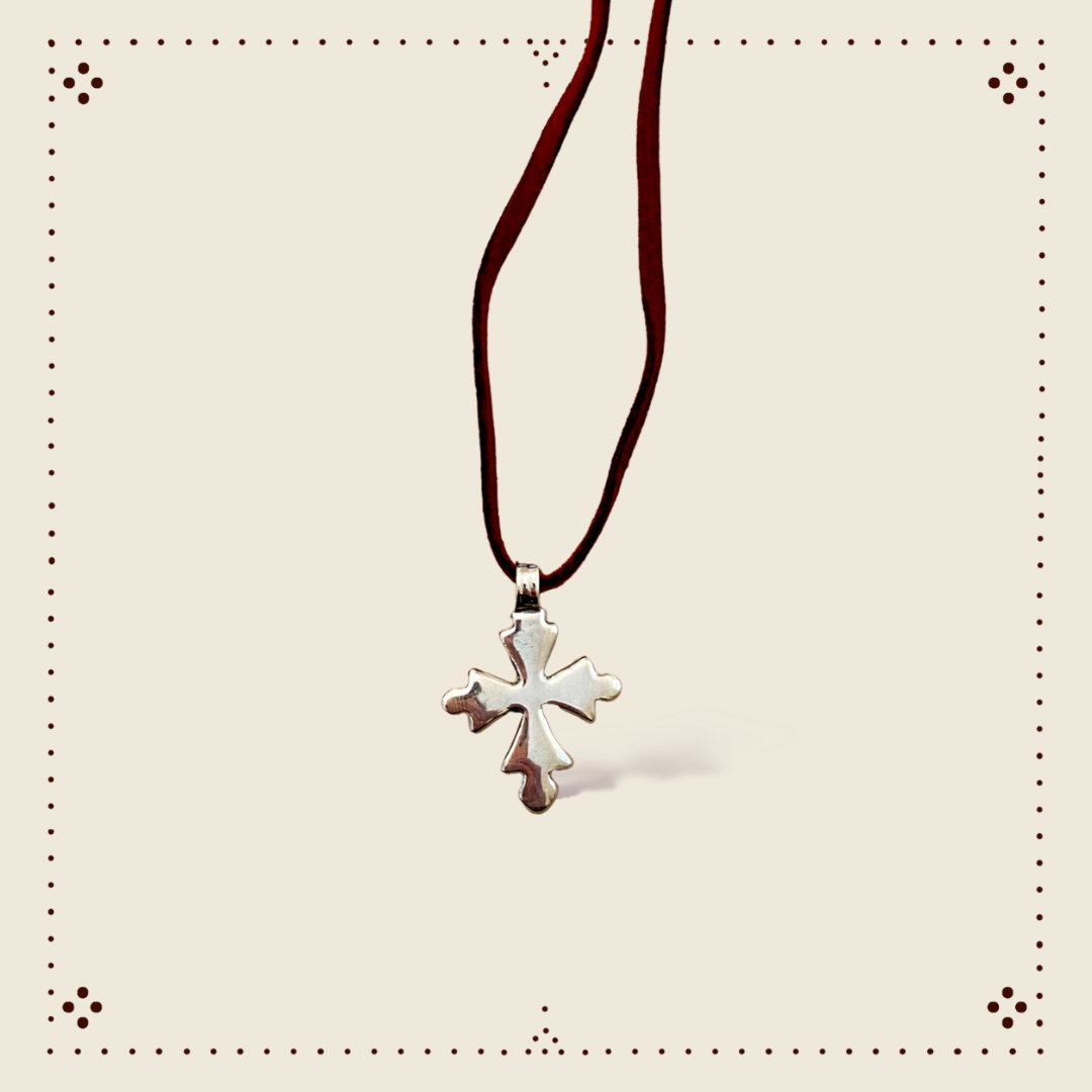 Each neck cross in this collection is suspended on a maroon leather thong. Beautiful to wear individually as well as layered up.