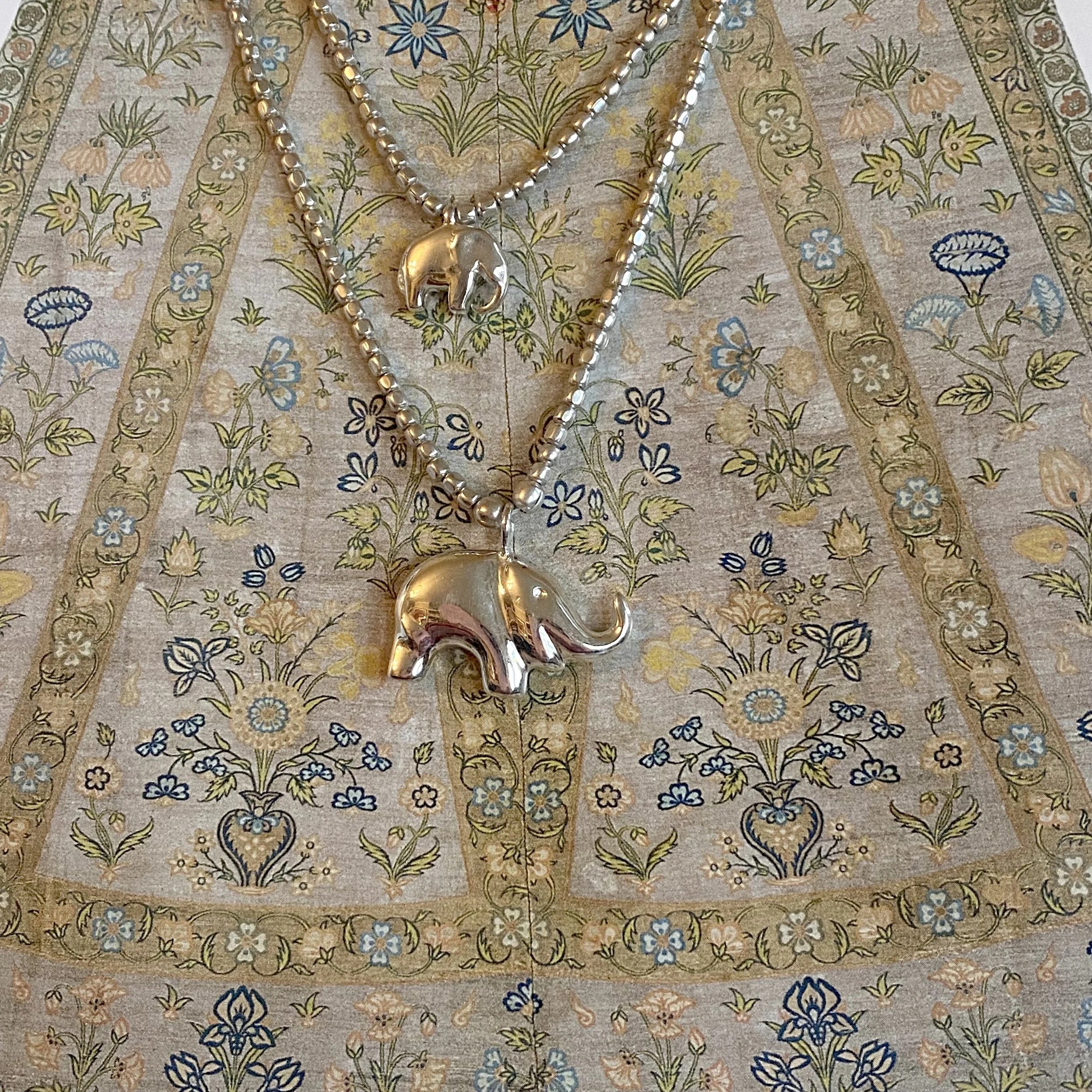 A double stranded necklace, each strand of silver beads has one of Sally’s signature silver elephant pendants.