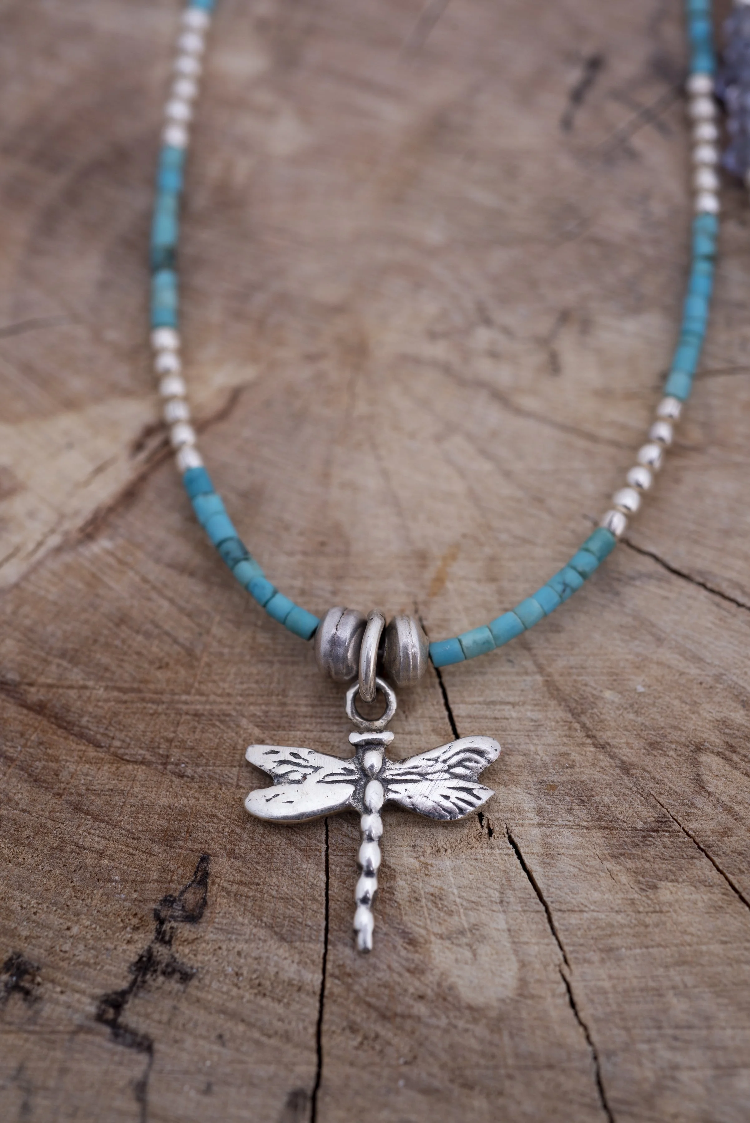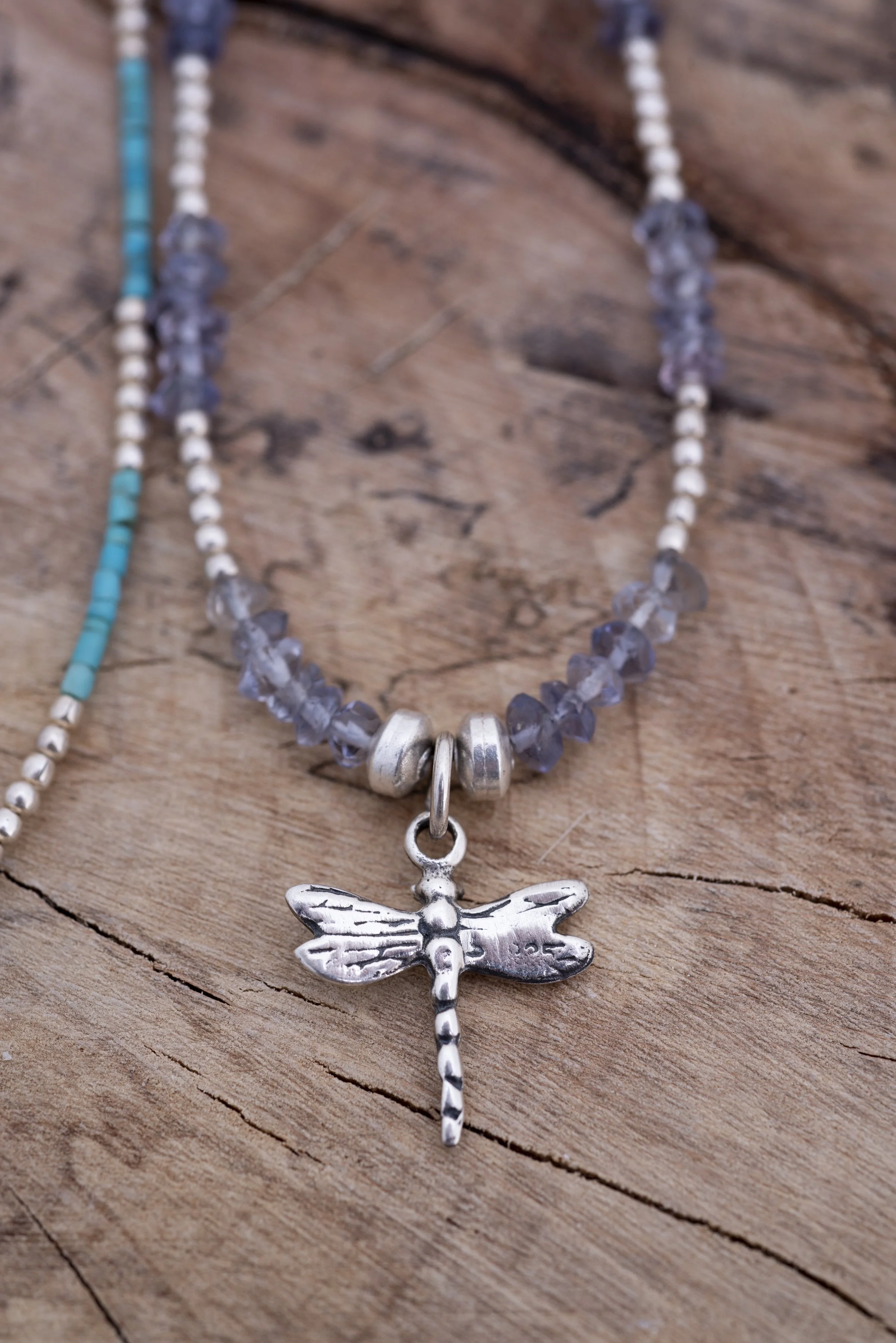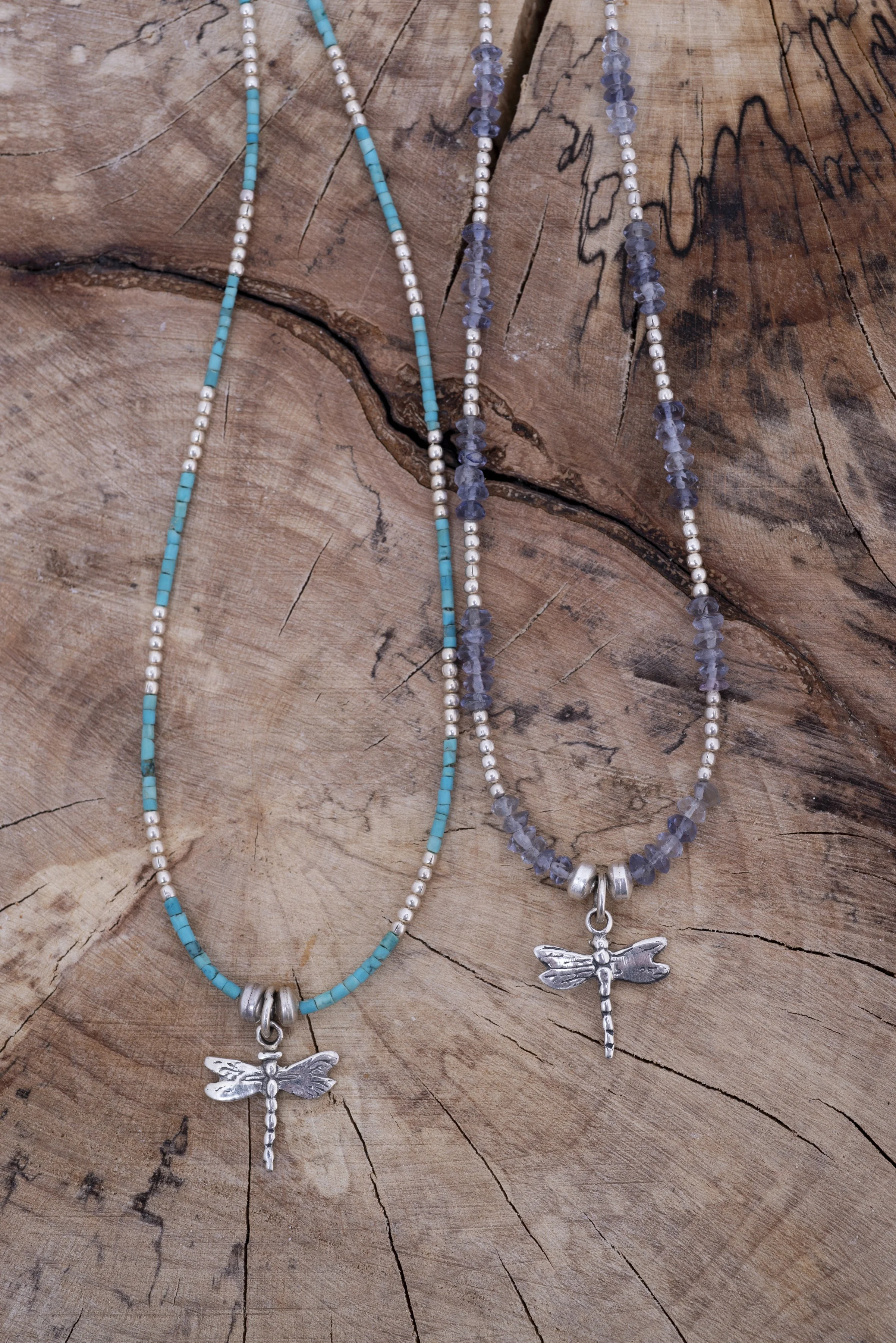 Dragonfly silver pendant necklace with either silver & iolite or silver and turquoise beads. This charming necklace is inspired by Sally’s early childhood in Cairo.
