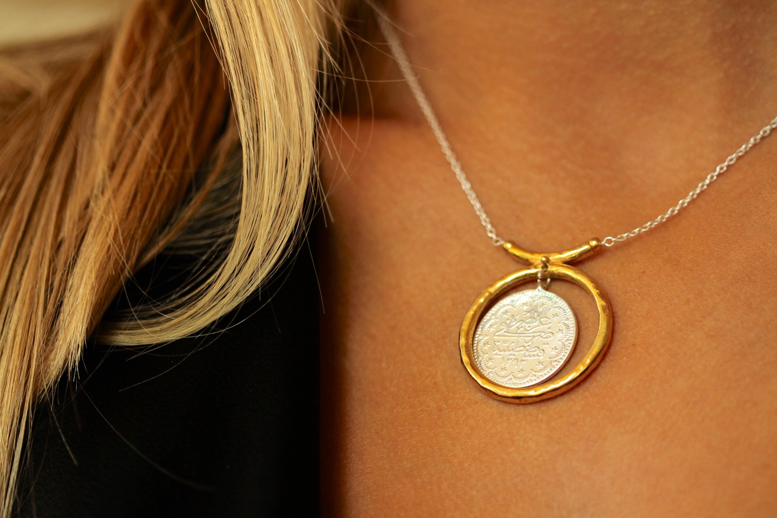 Prayer coin, within a silver gold plate circle on a silver chain.