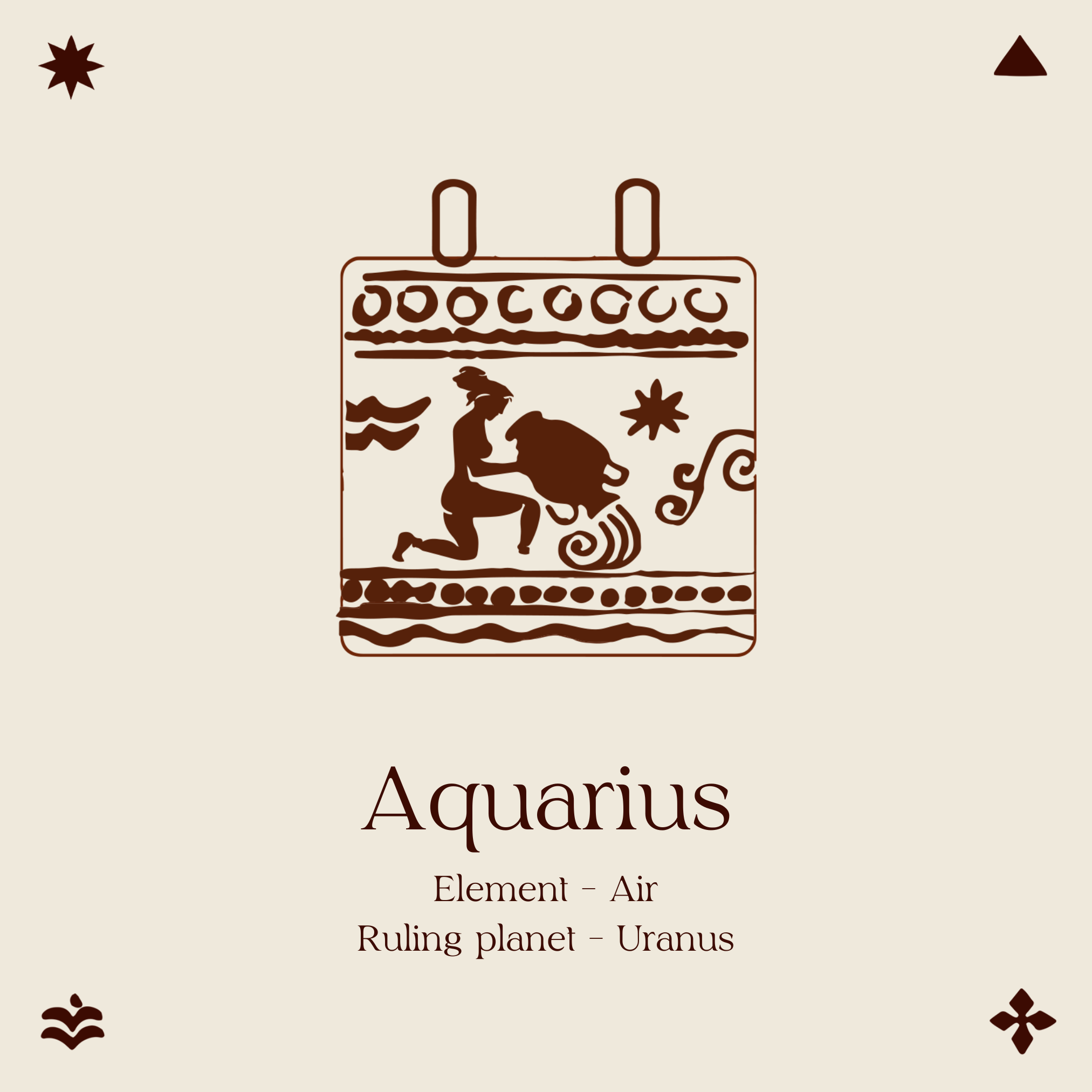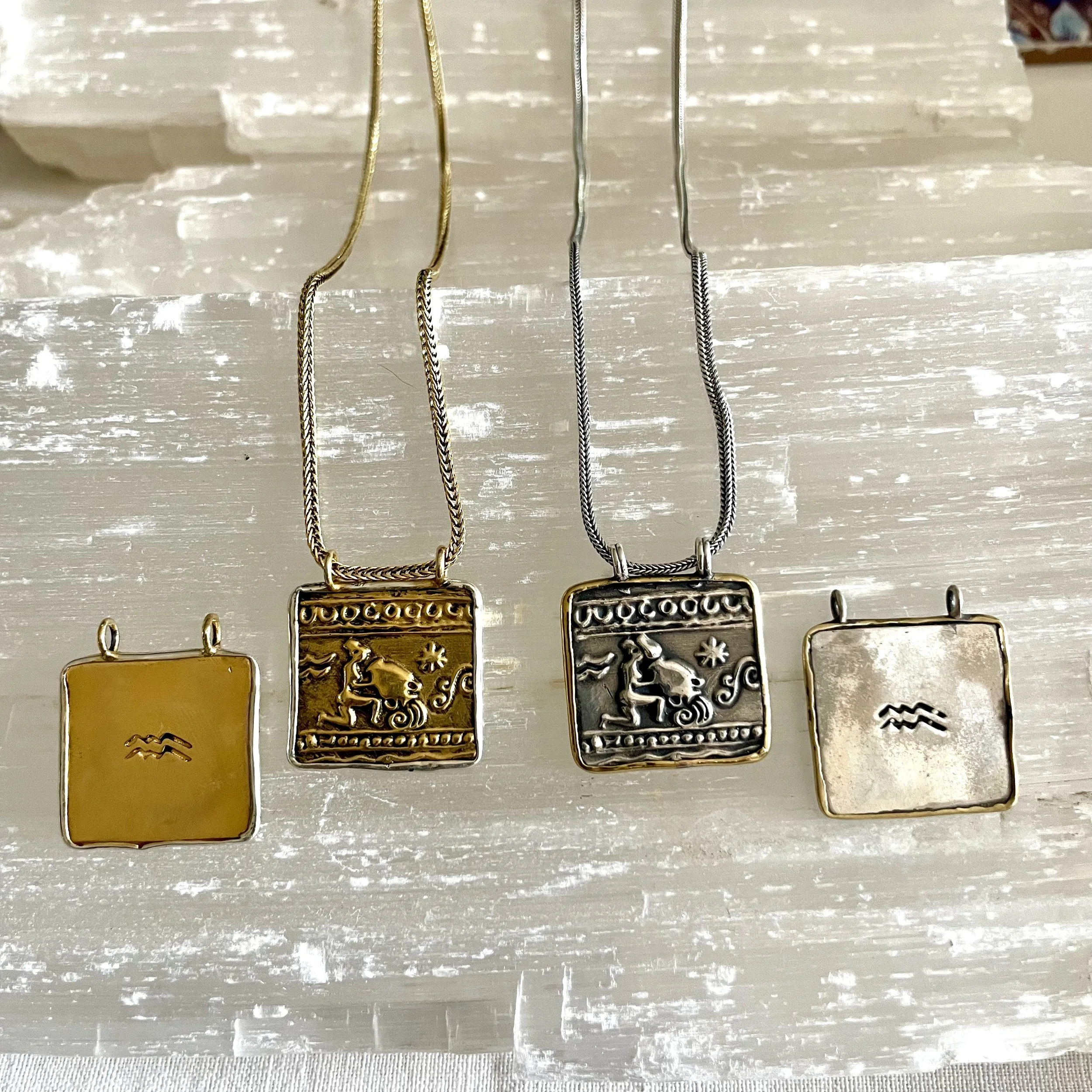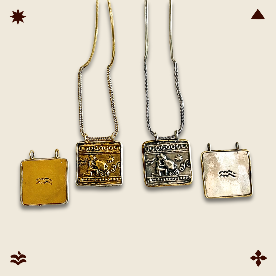 ZODIAC COLLECTION › AQUARIUS NECKLACE Image 1 of 3 Image 2 of 3 Image 3 of 3 AQUARIUS NECKLACE from £75.00 Pendant: 24 mm x 24 mmAquarius: January 20–February 18Element: AirRuling planet: UranusChain length: Adjustable 16 - 18” Material: Select Material Silver with brass mount Brass with silver mount PURCHASE Added! Pendant: 24 mm x 24 mmAquarius: January 20–February 18Element: AirRuling planet: UranusChain length: Adjustable 16 - 18”