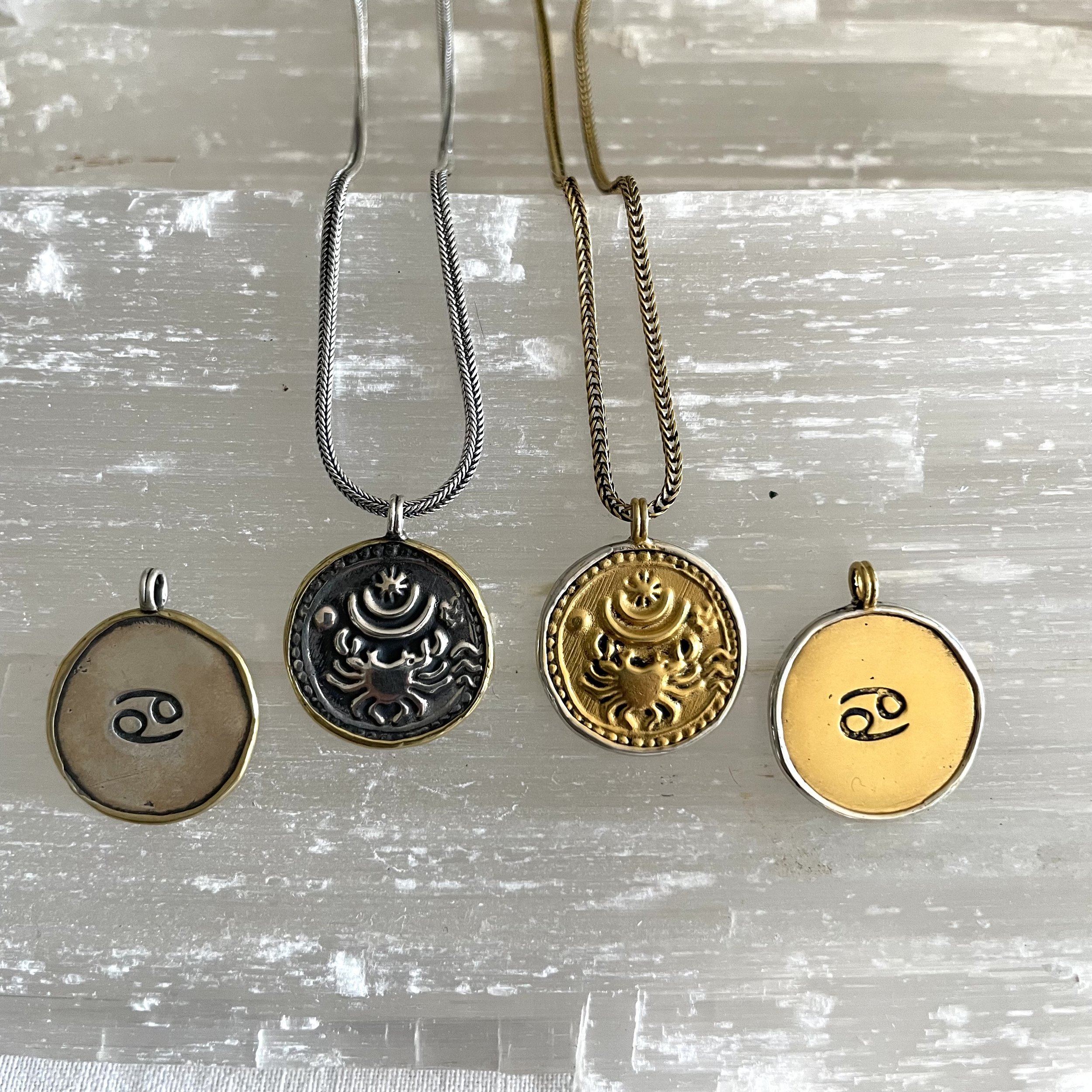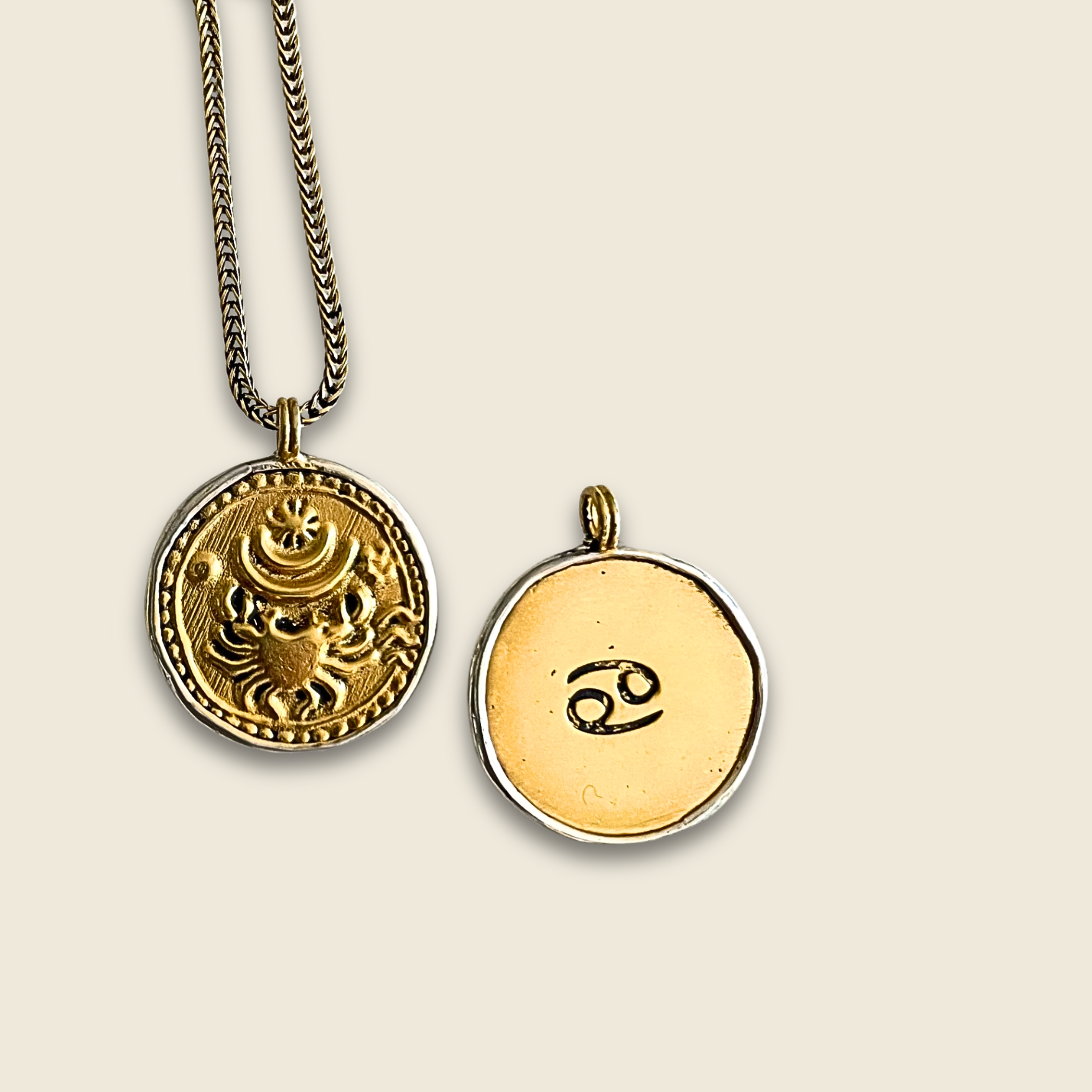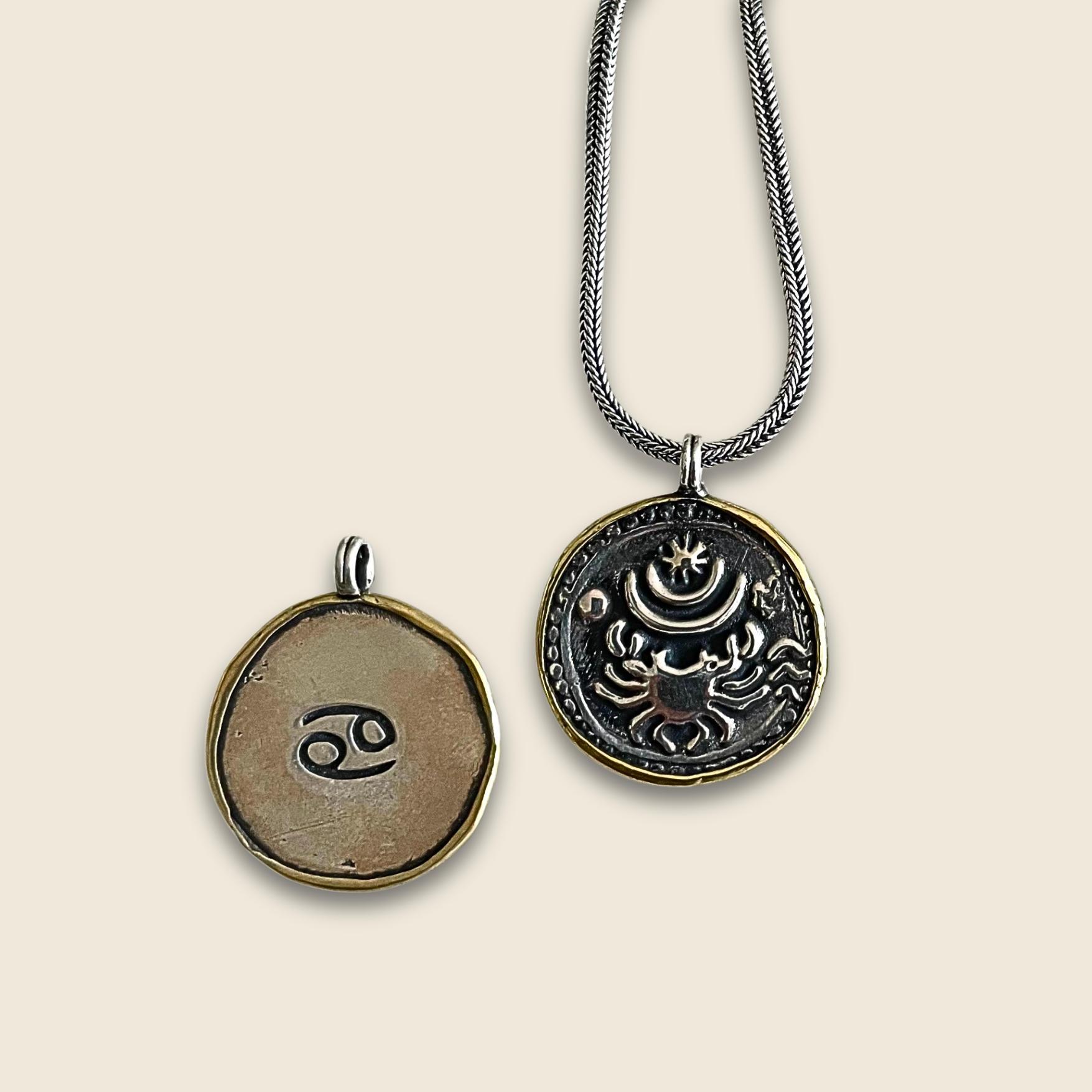 ZODIAC COLLECTION › CANCER NECKLACE Image 1 of 5 Image 2 of 5 Image 3 of 5 Image 4 of 5 Image 5 of 5 CANCER NECKLACE from £65.00 Pendant: 24 mm x 24 mmCancer: June 21 - July 22Element: WaterRuling planet: MoonChain length: Adjustable 16 - 18” Material: Select Material Silver with brass mount Brass with silver mount PURCHASE Added! Pendant: 24 mm x 24 mmCancer: June 21 - July 22Element: WaterRuling planet: MoonChain length: Adjustable 16 - 18”